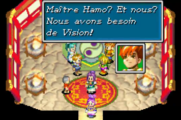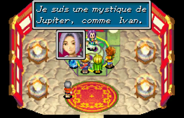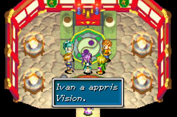 Et lorsque Maître Hamo parle d'une élève à qui elle n'a pas réussi à apprendre une psynergie, Feizhi arrive et affirme le contraire. Le transfert de pouvoir ayant réussi, elles s'apprêtent à partir aider Hsu coincé dans le passage Alpin, mais Garet l'interpelle. Maître Hamo apprends Vision à Ivan. Cette psynergie permet de révéler les zones voilées (généralement distinguées par des cercles de pierre). Dès que vous le pouvez, examinez la jarre à gauche de l'autel pour trouver 8 pièces d'or, puis allez de l'autre côté du ruisseau sur la droite et utilisez Vision pour récupérer une Eau de Jouvence. Vous partez alors vers le passage Alpin.