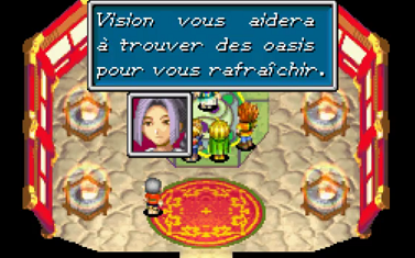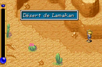La particularité de ce désert est que, dès que vous marchez sur le sable, la température du thermomètre sur la gauche augmente. Il vous faudra alors trouver des oasis grâce à Vision pour vous rafraîchir. Cependant certains cercles de pierre sont des leurres et cachent des monstres, ou bien des objets. Si la température est trop forte et que vous n'avez pas le temps d'aller à une oasis, votre groupe perdra quelques PV. |