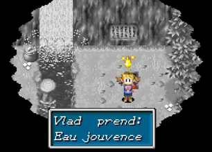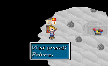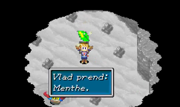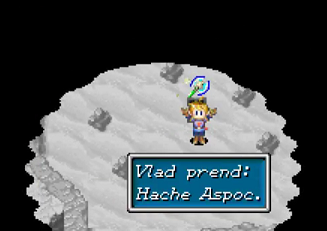 Objets : Pierre psynergie, Hache Aspoc, Potion, Djinn de Jupiter Smog, Poivre, 777 pièces d'or, Menthe, Cristal psy