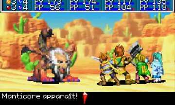 Ce monstre peut vous infliger divers changement de statut : poison, duperie... Ayez des Elixirs sur chacun de vos persos pour y remédier afin que Sofia soit toujours disponible pour attaquer, la faiblesse de ce boss étant l'eau. De même, ses psynergies infligeront des dégâts à plusieurs de vos persos en même temps. Une fois vaincu, vous remportez 3400 pièces d'or et un Cristal psy.